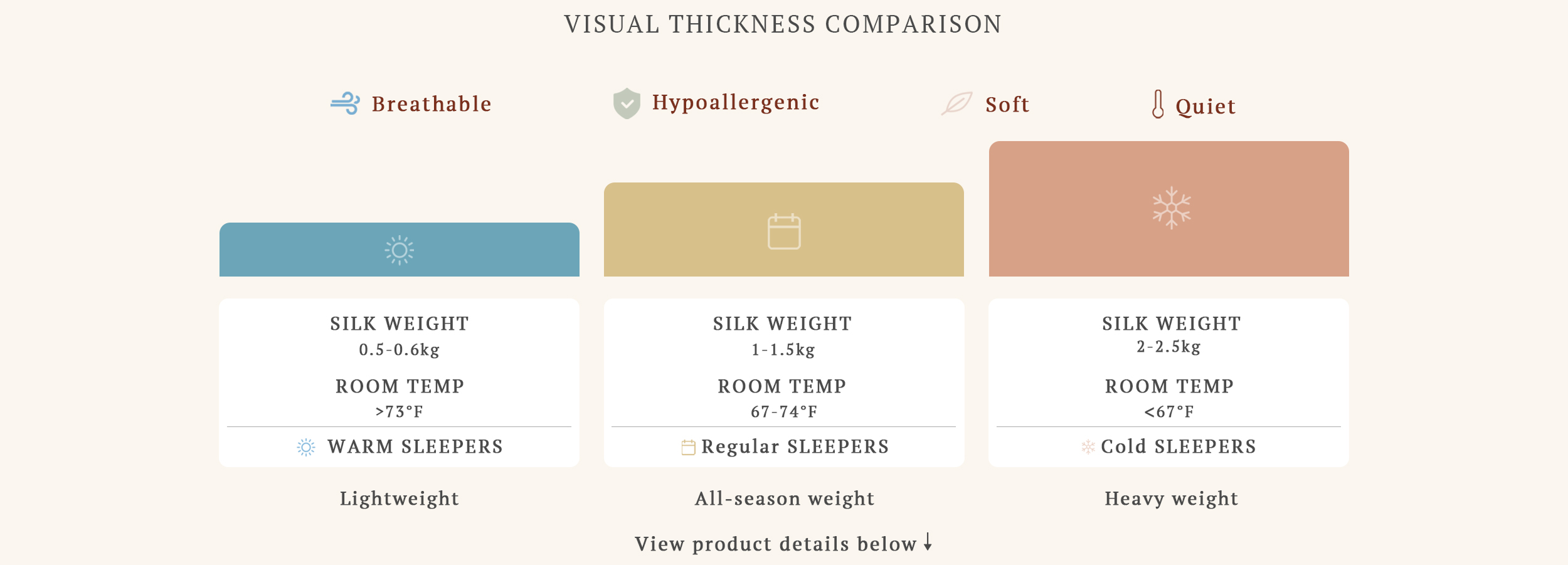We offer three Mulberry silk filling weight options—pick based on your room temperature and sleep preferences.